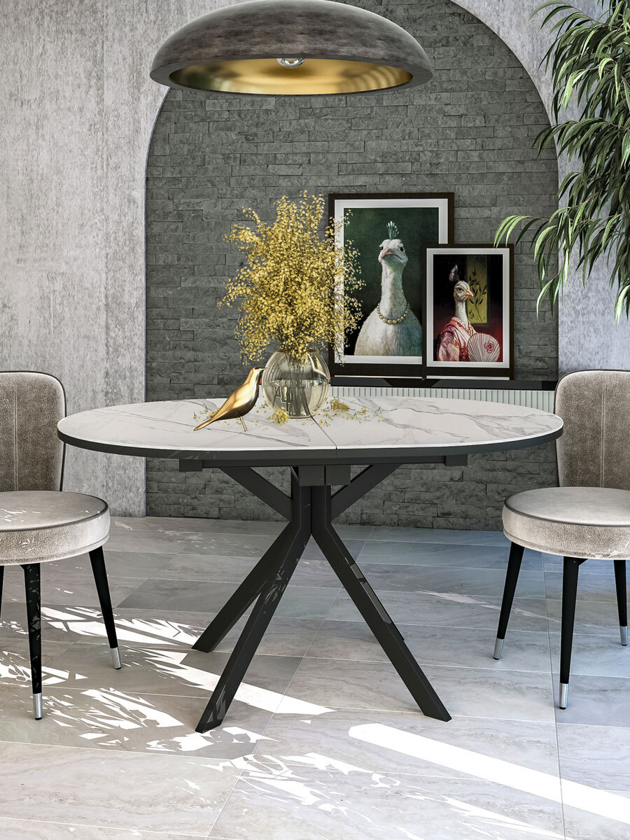 Оригинальный дизайнерский стол с глянцевой керамикой по лучшей цене на рынке. Как правило, за столом даже большой семьи собирается одновременно не более 2-3 человек. Днём мама кормит ребёнка, муж с женой ужинают вечером, дети обедают после школы. А значит, для активной городской семьи нет смысла занимать половину кухни большим столом. Размер стола позволяет использовать его как основной или в дополнение к островку для завтрака. RR900 компактный стол с цельной керамической столешницей, идеален для 3-х человек. Стол дизайнерского уровня, не подразумевает вставок и раскладного механизма. Глянцевая керамика - очень эффектный материал, который сохряняет все свойства обычной керамики. Устойчивость к высокой температуре до 1000°С, твердость выше, чем твердость металла (а это значит на ней не останутся следы от металлических приборов), не впитывает загрязнения и влагу.