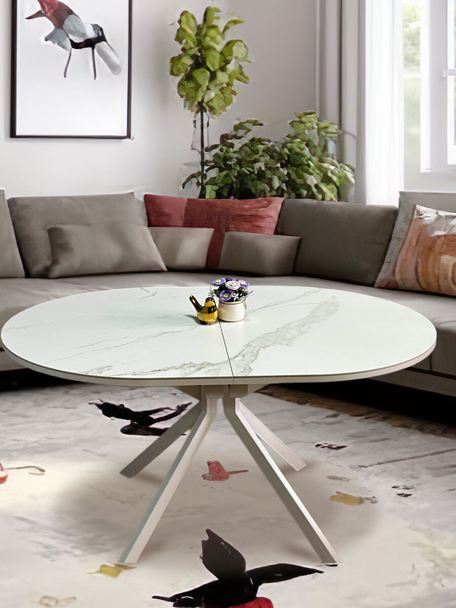 Оригинальный дизайнерский стол с глянцевой керамикой по лучшей цене на рынке. Как правило, за столом даже большой семьи собирается одновременно не более 2-3 человек. Днём мама кормит ребёнка, муж с женой ужинают вечером, дети обедают после школы. А значит, для активной городской семьи нет смысла занимать половину кухни большим столом. Размер стола позволяет использовать его как основной или в дополнение к островку для завтрака. RR900 компактный стол с цельной керамической столешницей, идеален для 3-х человек. Стол дизайнерского уровня, не подразумевает вставок и раскладного механизма. Глянцевая керамика - очень эффектный материал, который сохряняет все свойства обычной керамики. Устойчивость к высокой температуре до 1000°С, твердость выше, чем твердость металла (а это значит на ней не останутся следы от металлических приборов), не впитывает загрязнения и влагу.
