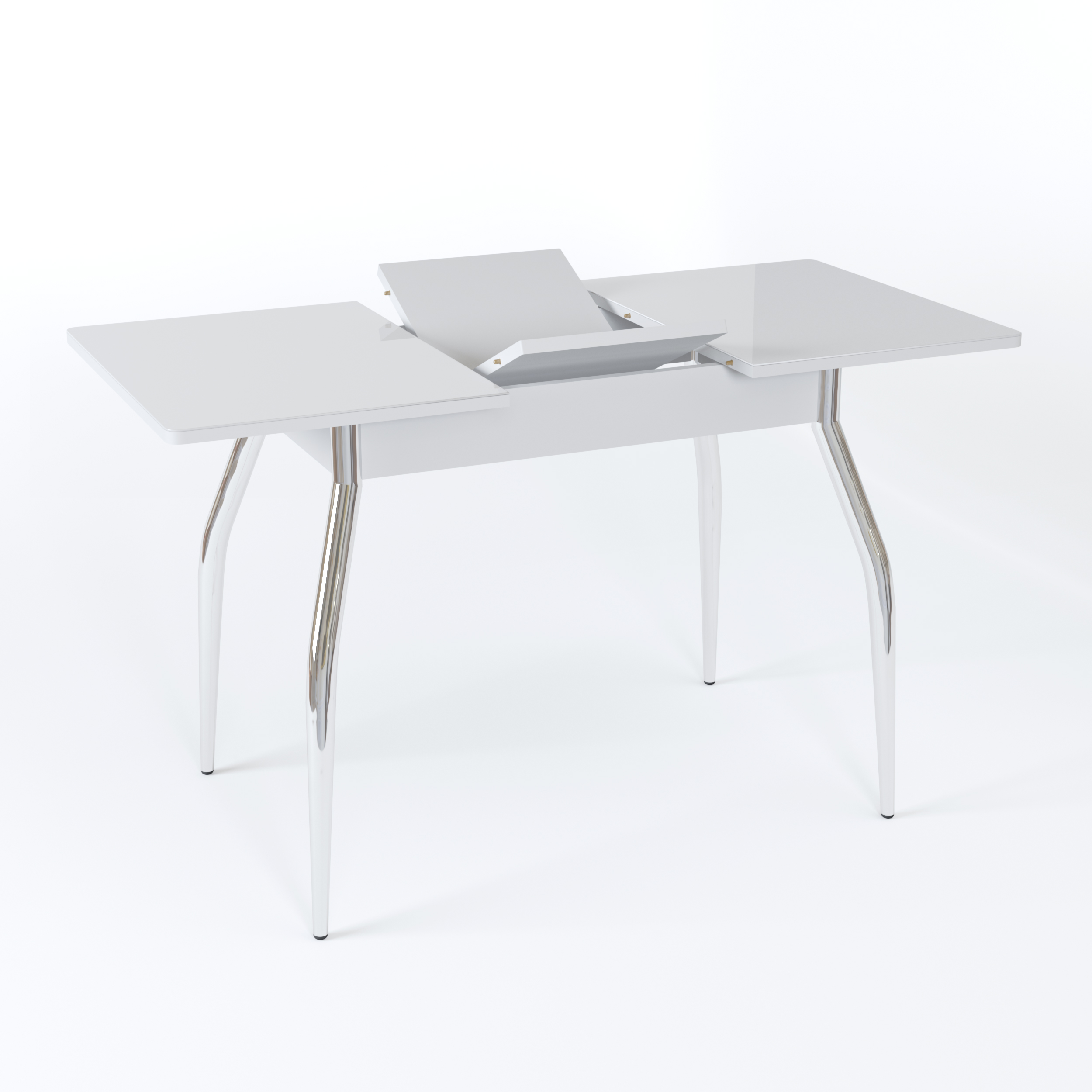 Длина прямоугольной столешницы - 90 см, с помощью механизма “бабочка” ее можно еще немного увеличить - до 1 м 20 см. Изготовлена она из сочетания ЛДСП и МДФ, сверху - закаленное окрашенное стекло. Возможны варианты с кожзамом, фотопечатью. Ноги прямые или гнутые, могут быть сделаны из хромированной стали или массива березы белого, кремового или цвета венге. В любой комбинации служат надежной опорой изделию даже в разложенном виде.