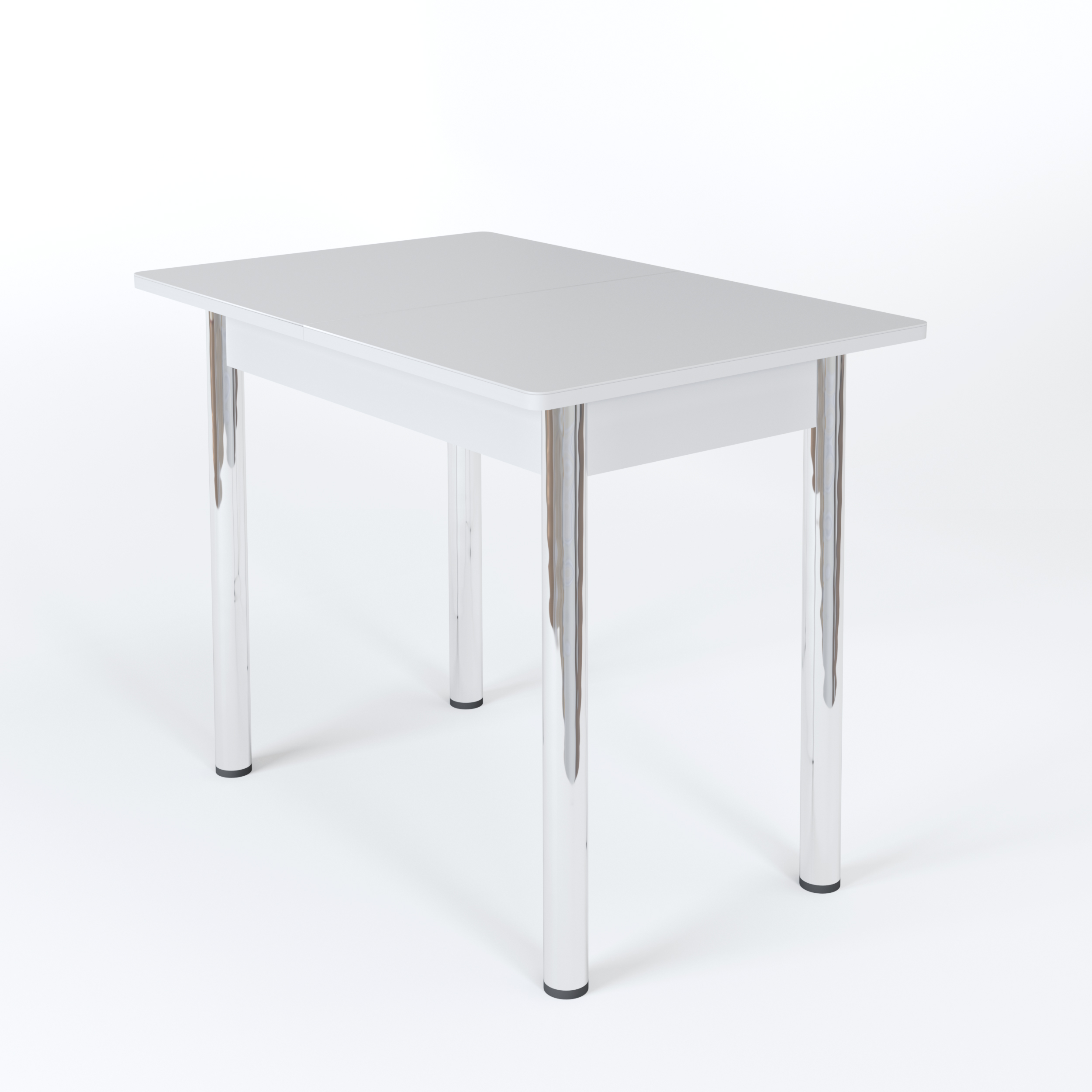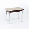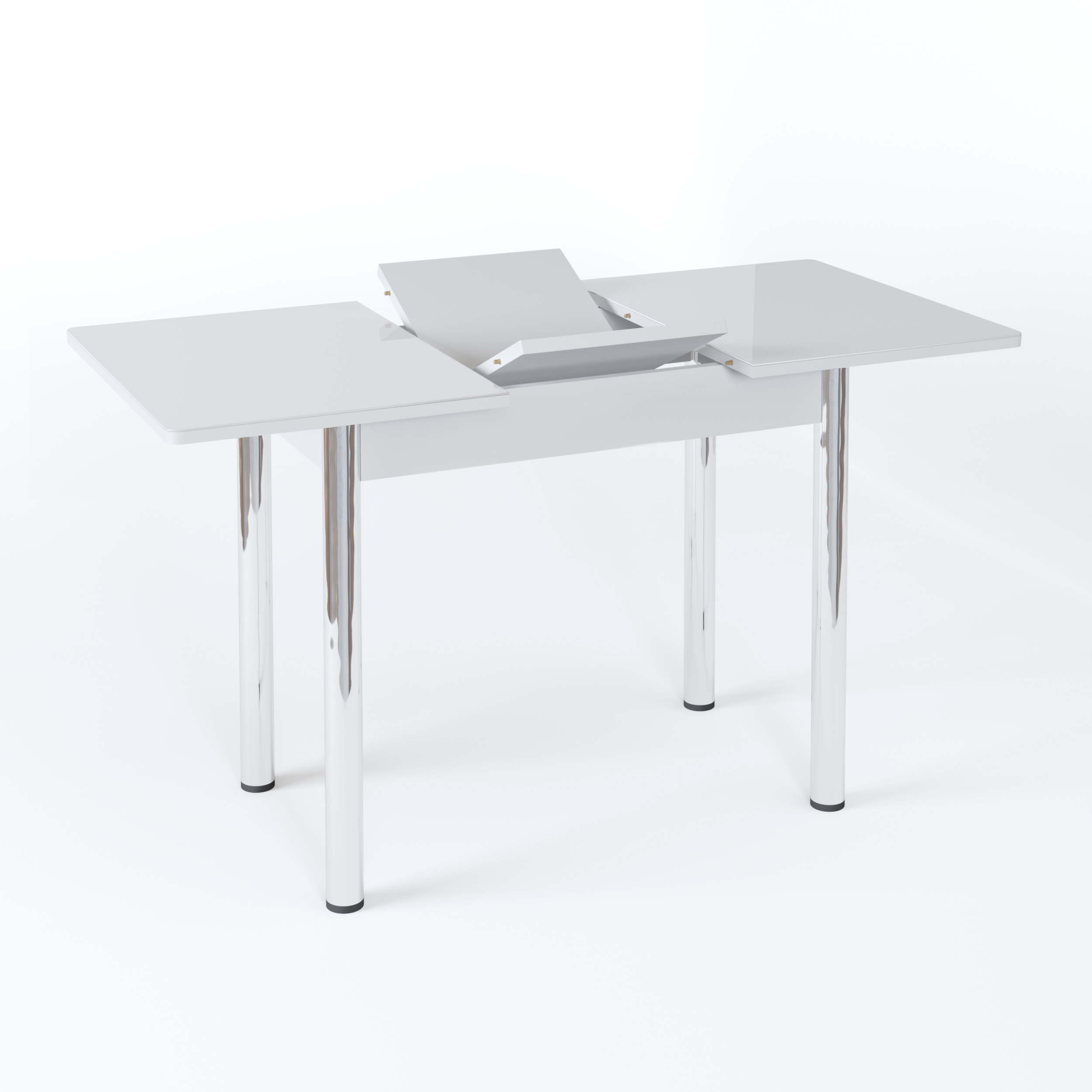 Длина прямоугольной столешницы - 90 см, с помощью механизма “бабочка” ее можно еще немного увеличить - до 1 м 20 см. Изготовлена она из сочетания ЛДСП и МДФ, сверху - закаленное окрашенное стекло. Возможны варианты с кожзамом, фотопечатью. Ноги прямые или гнутые, могут быть сделаны из хромированной стали или массива березы белого, кремового или цвета венге. В любой комбинации служат надежной опорой изделию даже в разложенном виде.