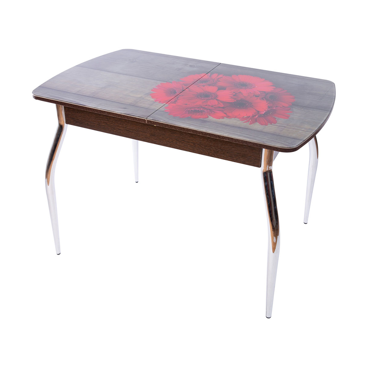 Раскладной кухонный стол со стеклом Стол Чикаго СТ 1100(1400)*680*750 фотопечать стекл Ноги 01 гальваника (КРАСНЫЕ ГЕРБЕРЫ НА СЕРОЙ ДОСКЕ цвет ВН) - практичный и современный предмет мебели, который благодаря большому количеству модификаций подойдет к любому интерьеру и будет долго служить вашей семье.