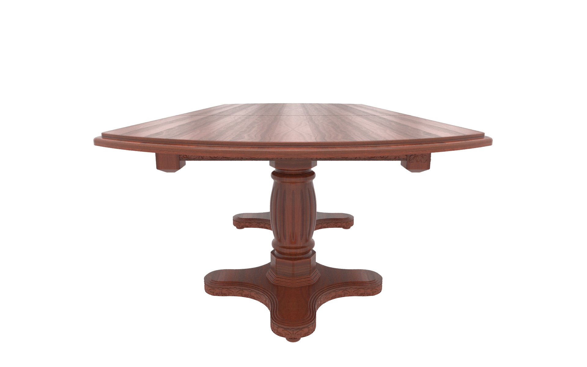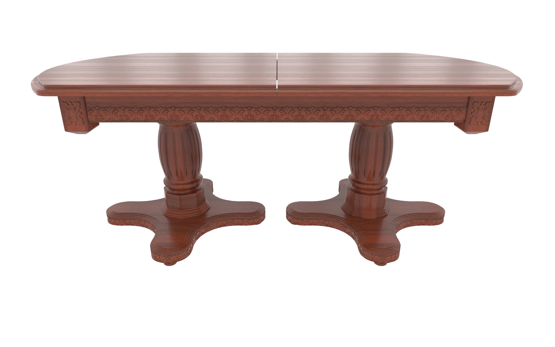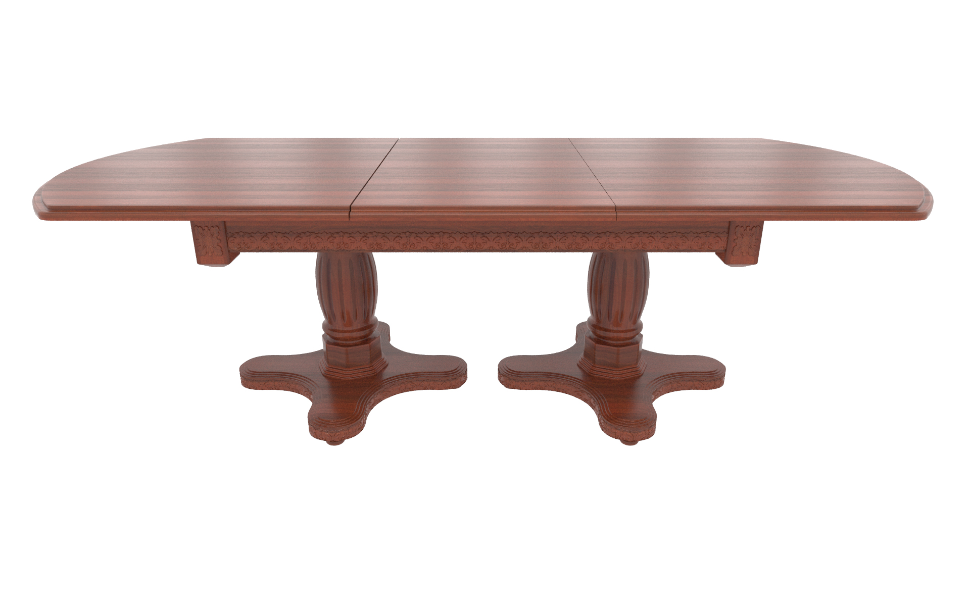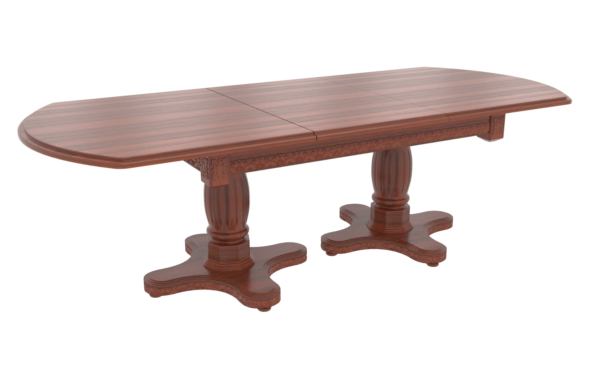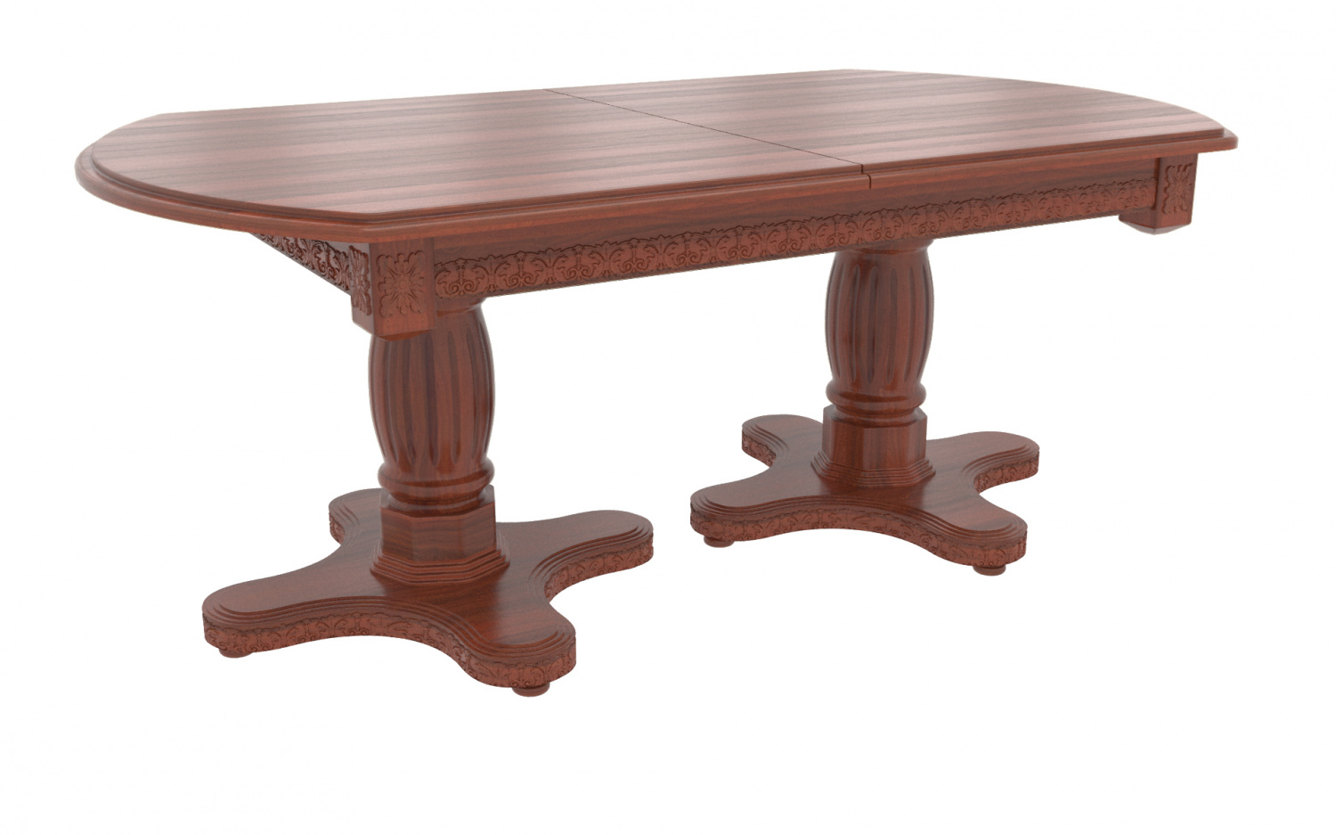 Большой овальный стол из массива березы, который с помощью трех вставок может быть увеличен почти вдвое. В собранном виде вставки находятся внутри стола. Одна из трех тонировок дерева на выбор покупателя.