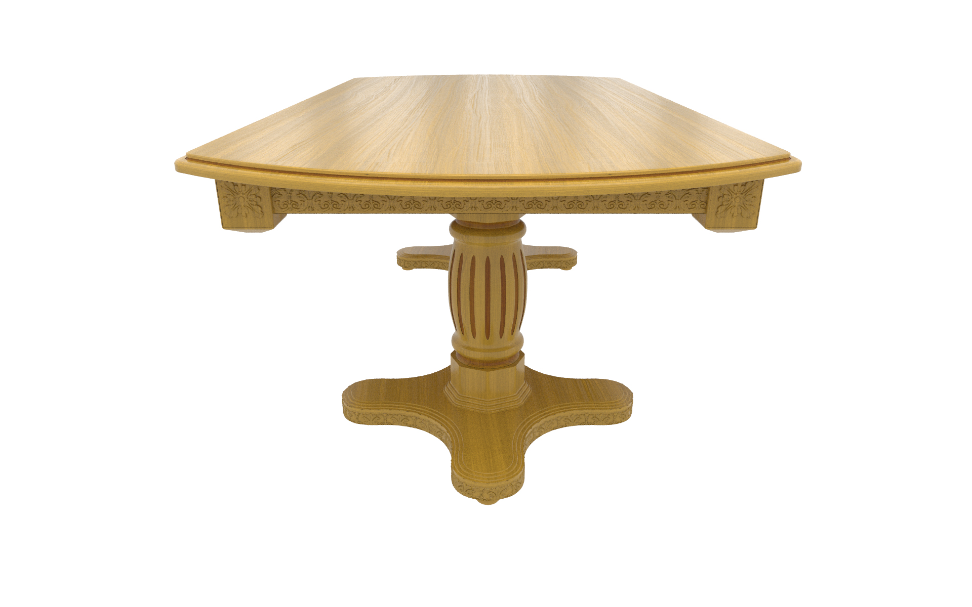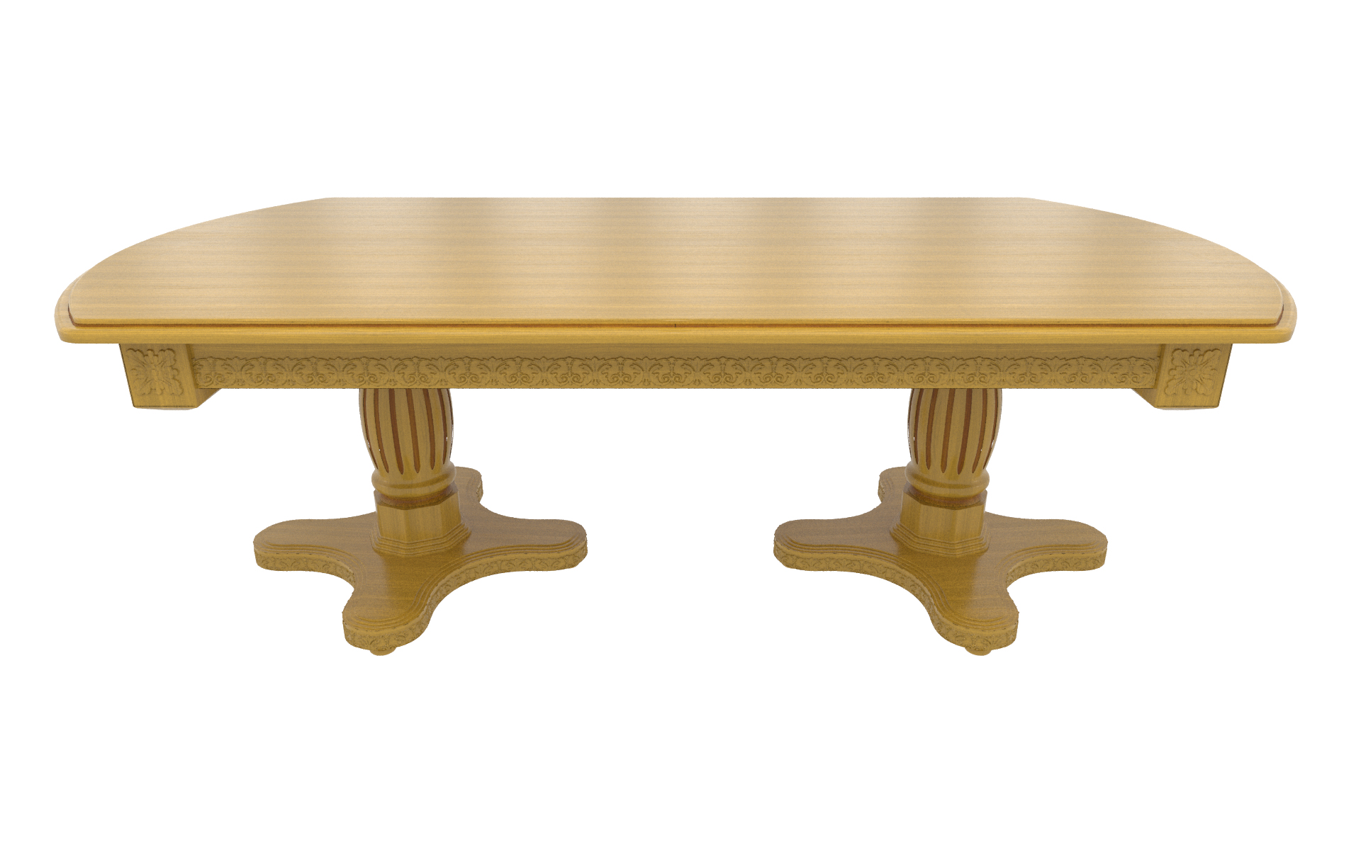 Большой овальный стол из массива березы, который с помощью трех вставок может быть увеличен почти вдвое. В собранном виде вставки находятся внутри стола. Одна из трех тонировок дерева на выбор покупателя.