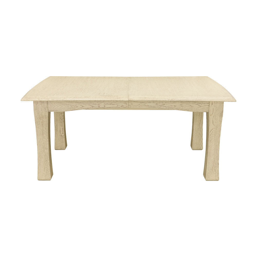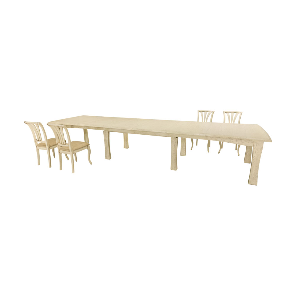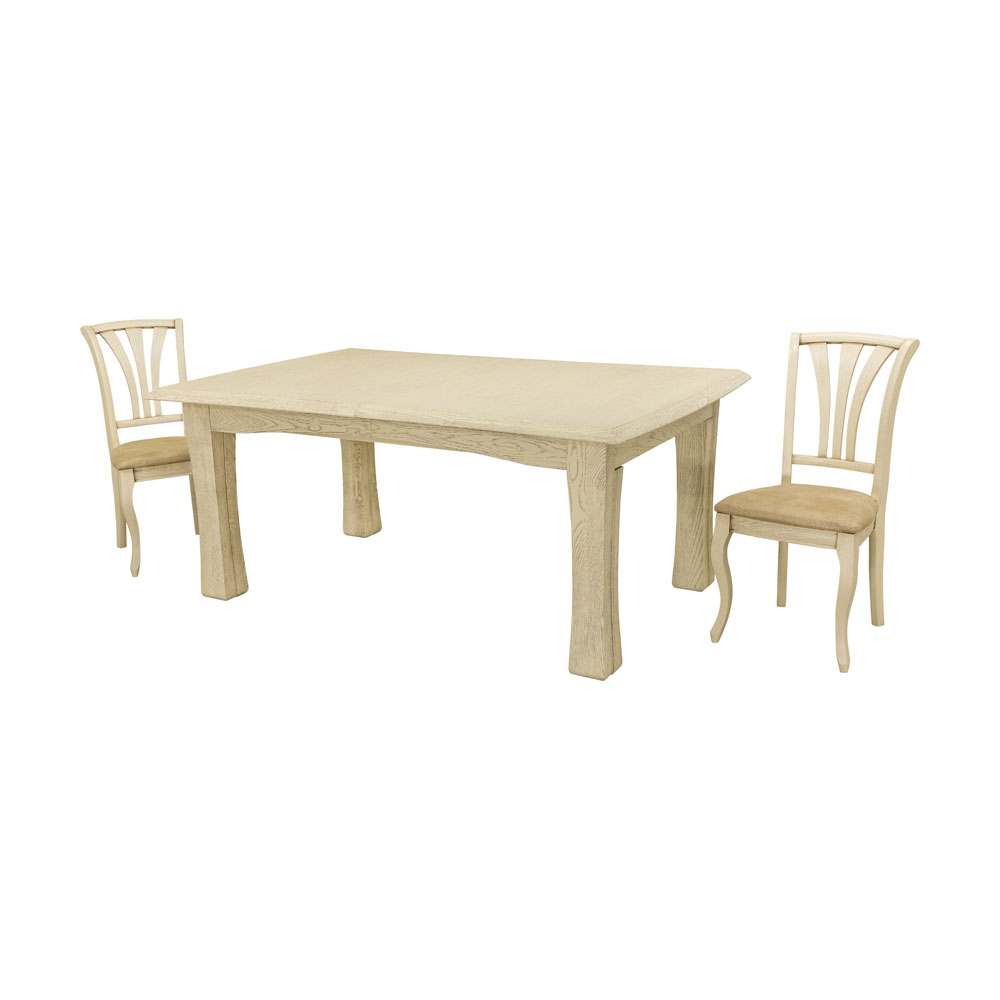 В сложенном виде стол имеет стандартный размер в 180 см, но внутри спрятаны целых 4 вставки по 65 см, которые устанавливаются вручную. Таким образом, максимальная длина столешницы - почти 4.5 метра. Форма - прямоугольник со слегка выгнутыми поперечными сторонами, ножки невысокие и устойчивые, в масштабе повторяют форму столешницы. Основные элементы конструкции выполнены из массива дуба, экологически чистого, прочного и дорогого материала. Такой стол будет служить верой и правдой не одному поколению вашей семьи.<br>