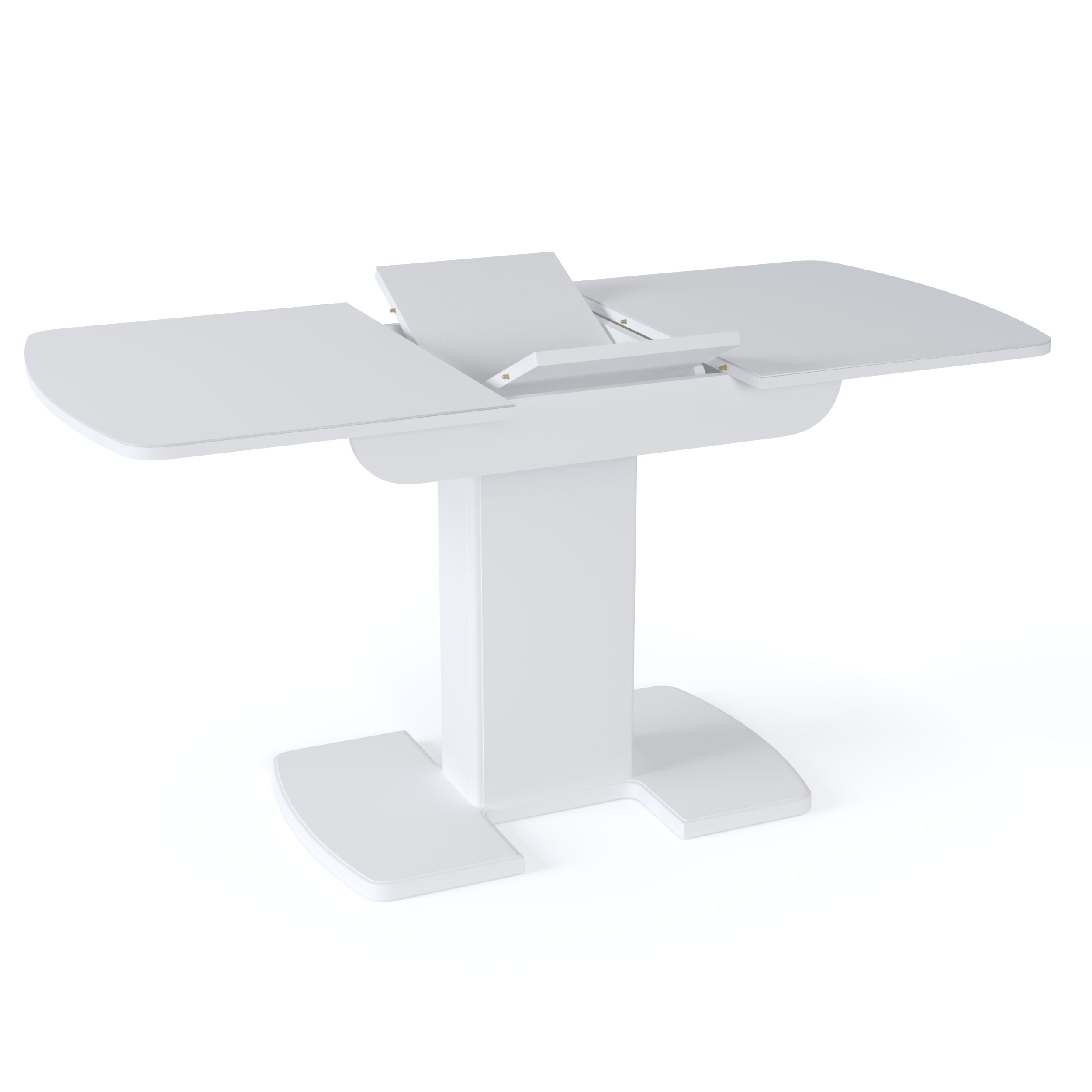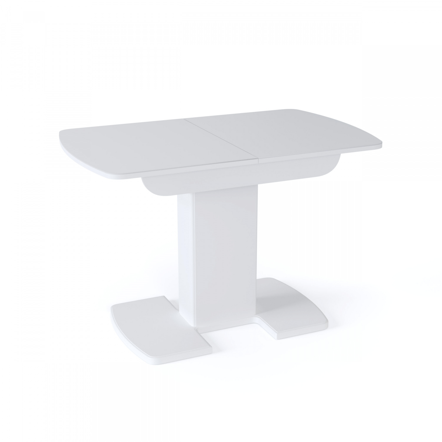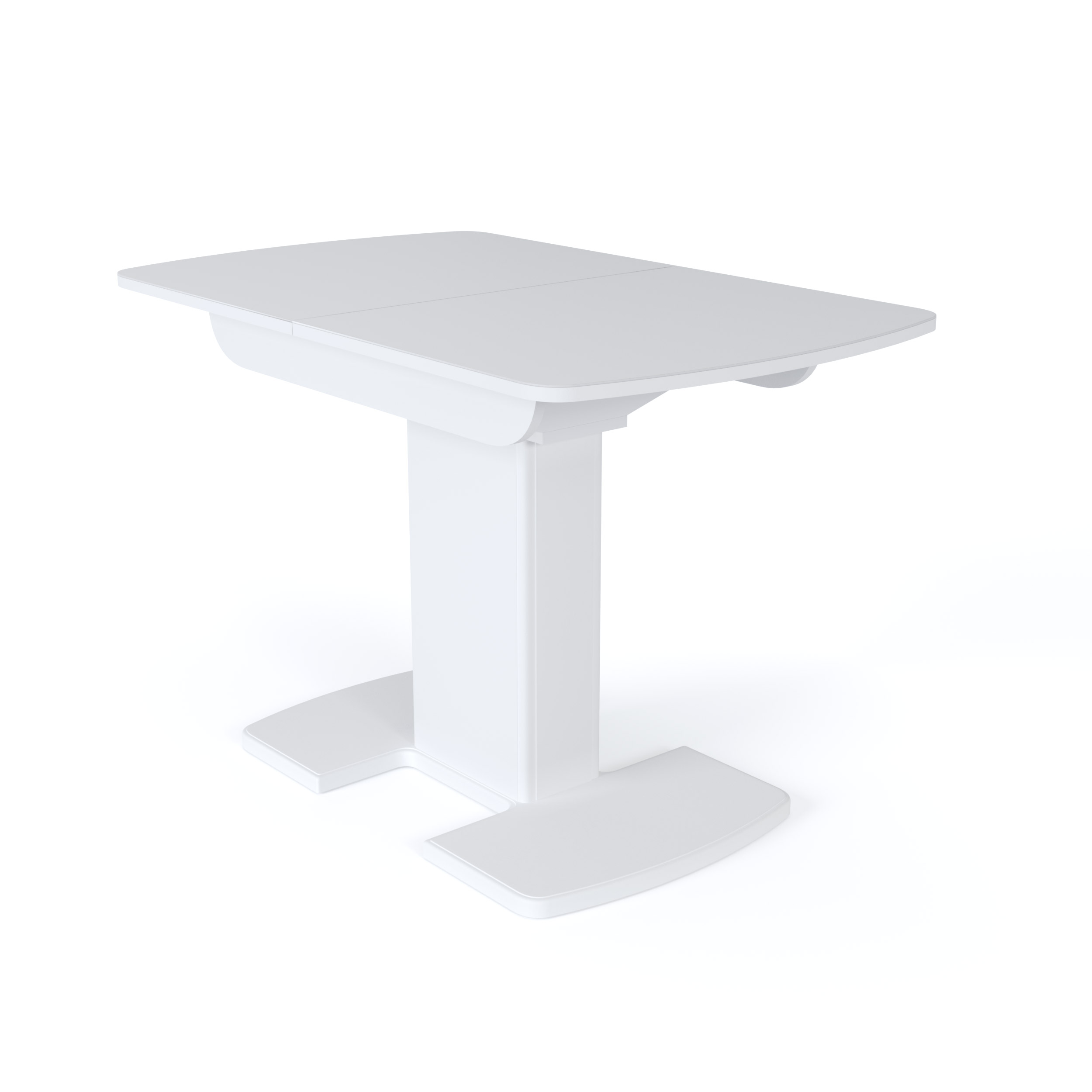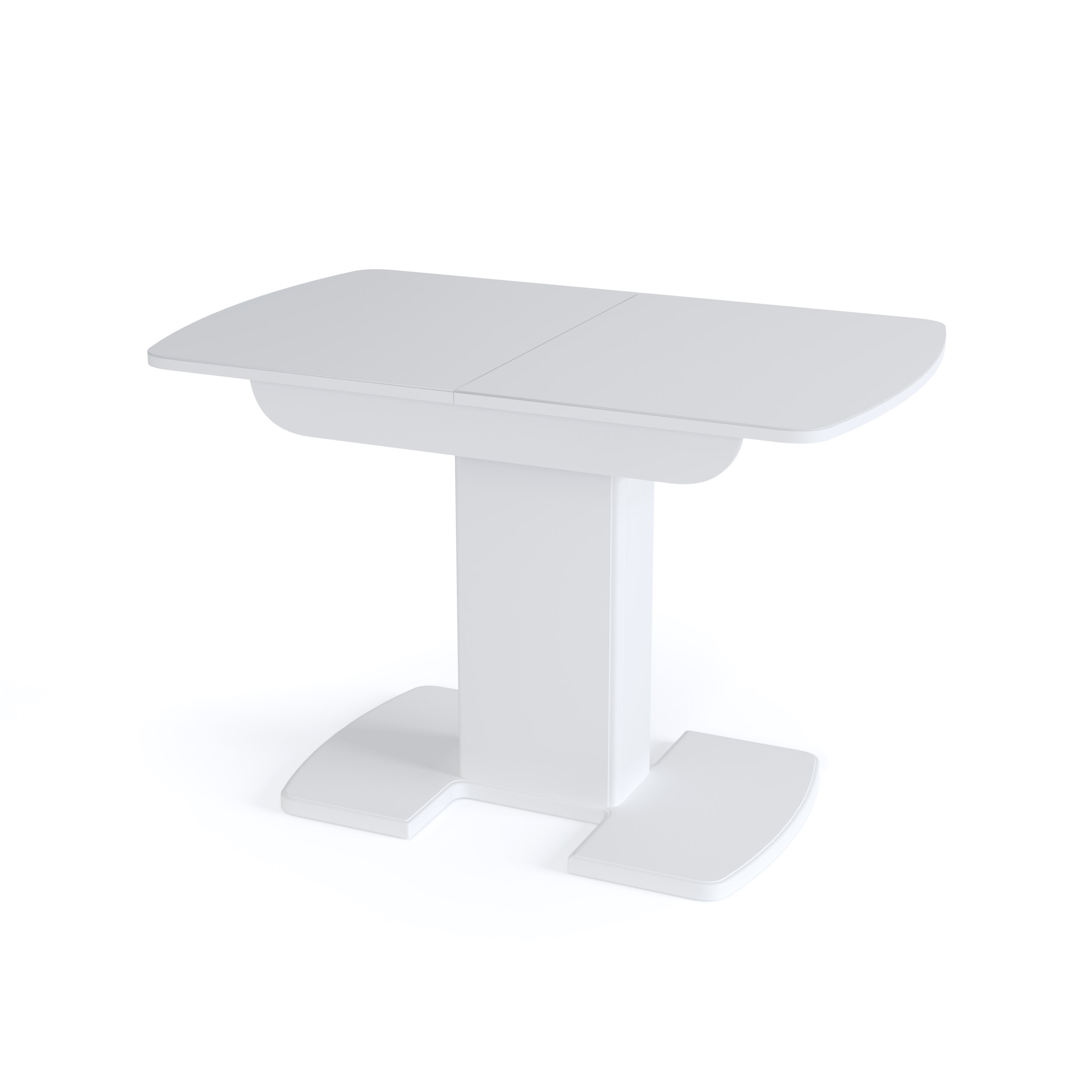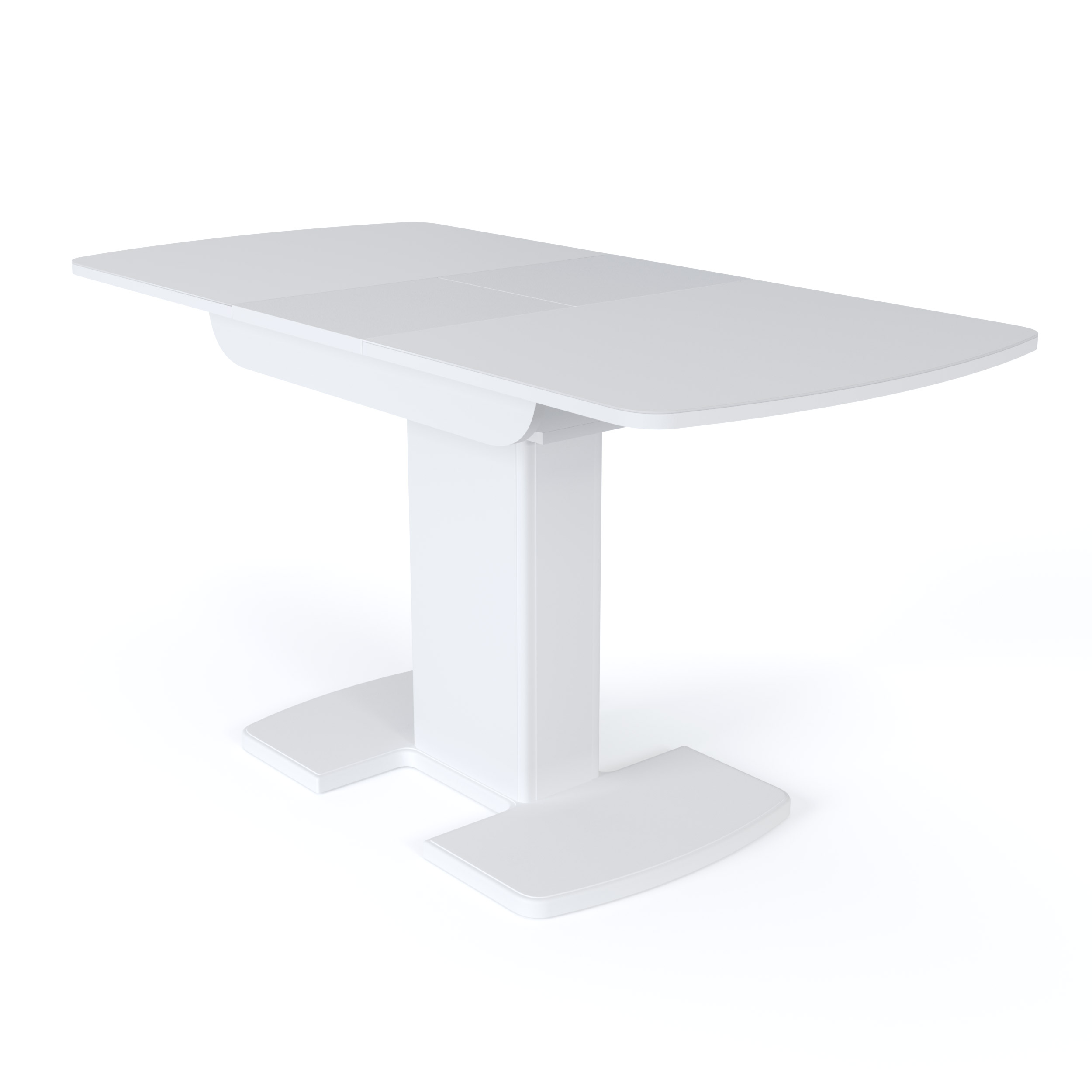 Недорогая функциональная и стильная модель.  Каркас стола изготовлен из ЛДСП, цвет белый или венге. Столешница из МДФ с закаленным стеклом, матовым или глянцевым на выбор. Имеет полуовальную форму, размер 110 см с возможностью увеличения еще на 30 см. Опирается на одну ножку, переходящую в две плоские опоры на полу.