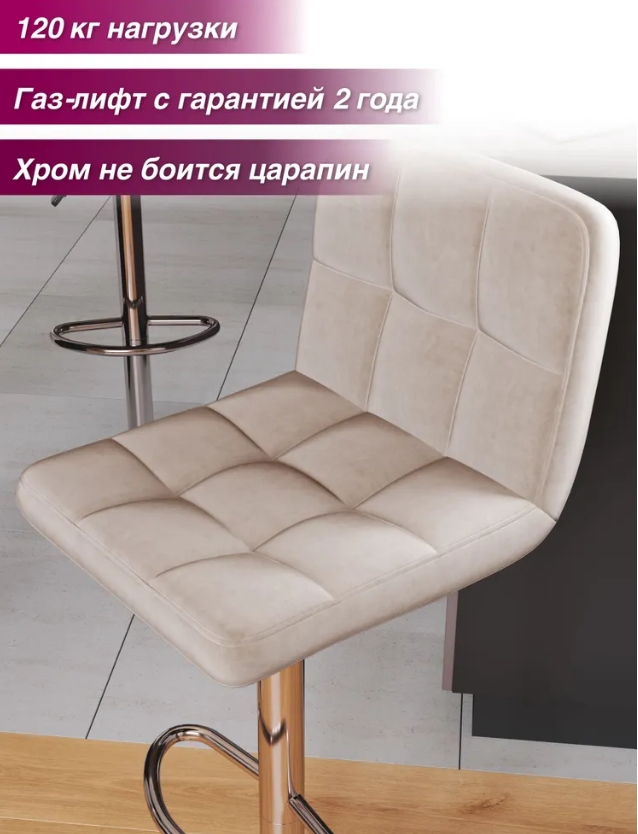 Барный стул вращается на 360 градусов. Хромированная опора не боится царапин и придаёт стулу