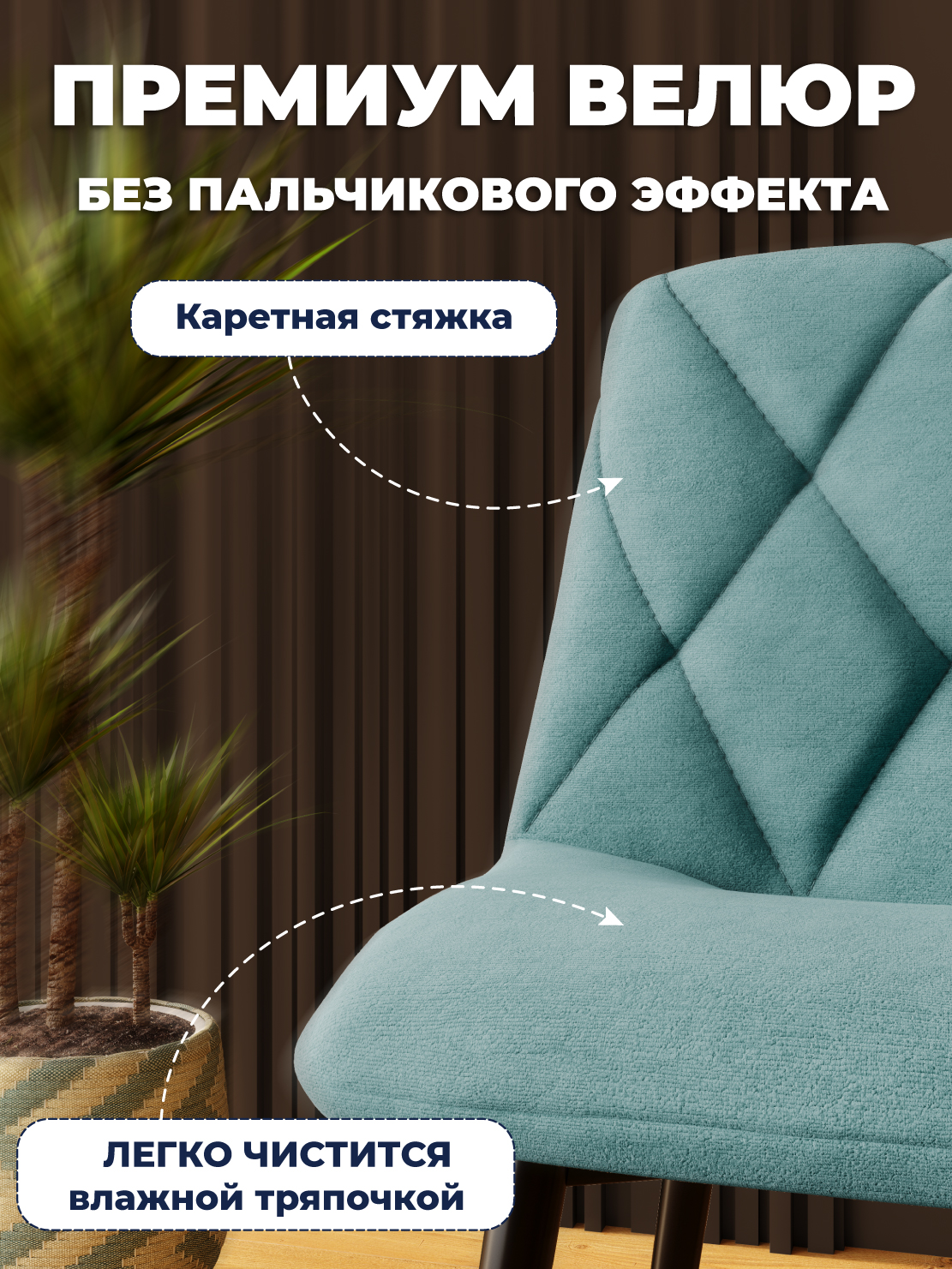 Любители мягких стульев делятся на два непримиримых лагеря. Первые хотят бархатной нежности, а значит им нужен велюр с длинным ворсом. А вторые также непримиримо ненавидят следы, которые остаются на таких стульях от прикосновений. При этом ни тем ни другим не нравится велюр с коротким ворсом, который больше напоминает микрофибру, чем бархат. Примирить и понравиться всем может наш новый стул! Проверенная модель с красивой каретной стяжкой на спинке имеет велюр средней длины с особым плетением. Поверхность стула напоминает уютное махровое полотенце. Велюр не имеет пальчикового эффекта и не оставляет следов после сидения. Ткань легко чистится влажной тряпочкой в мыльном растворе практически от любых загрязнений. Особая структура ткани обладает еще более высокой теплопроводностью - на стуле не жарко сидеть даже в самый зной.