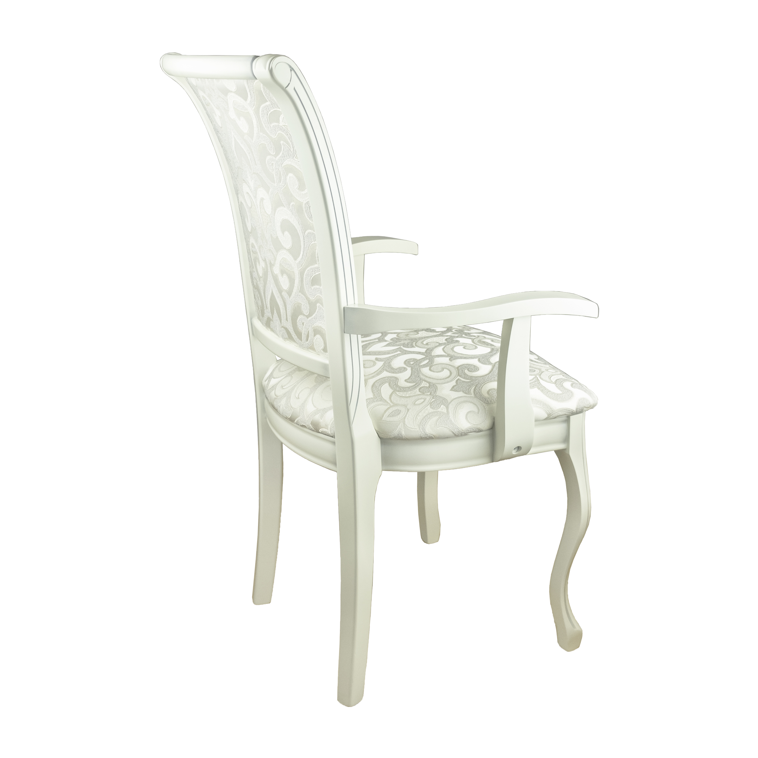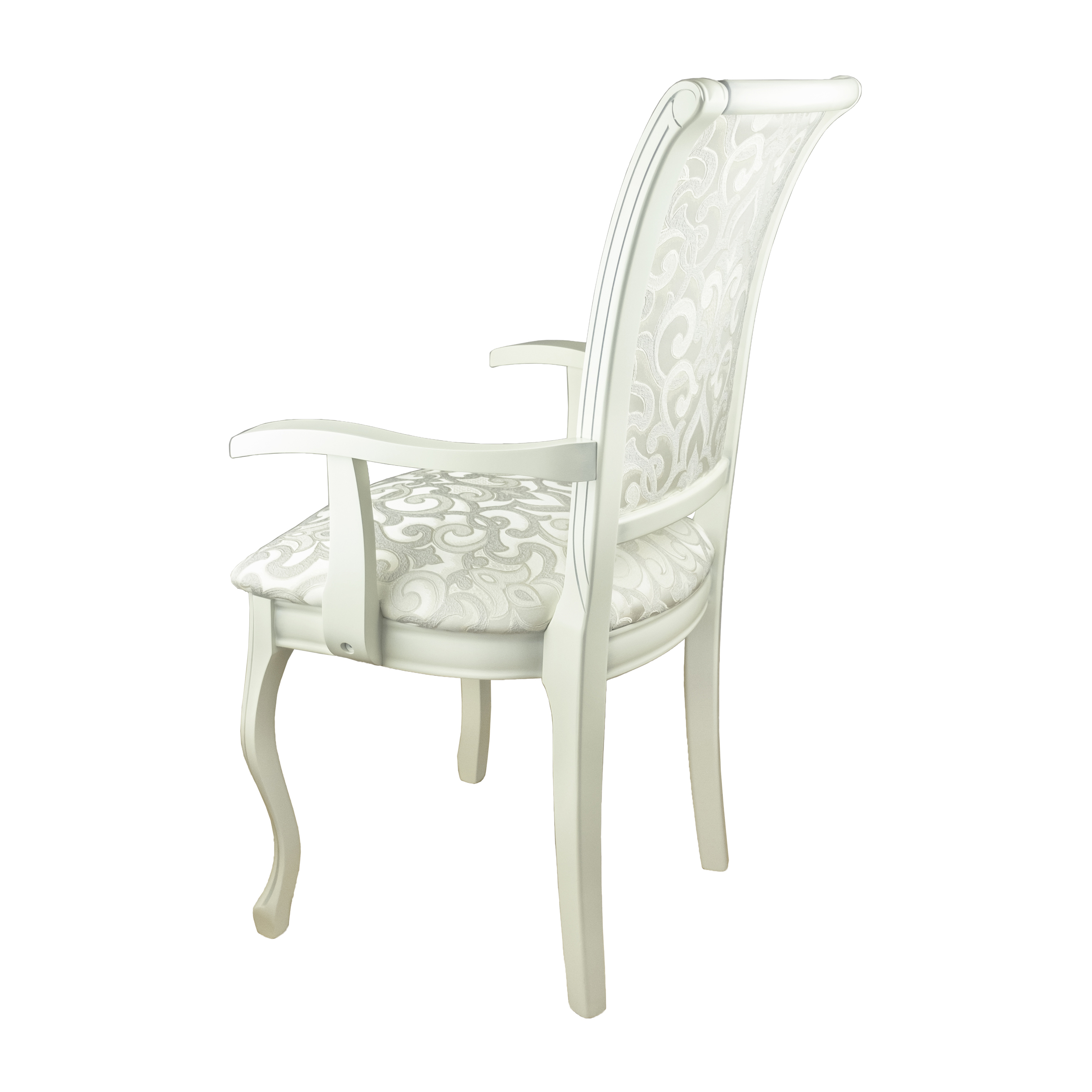 Этот стул-кресло выглядит невероятно стильно: изогнутые ножки и резной декор на каркасе придают ему элегантности. Мягкая спинка с оптимальным углом наклона, удобные подлокотники, глубокое сиденье - стул просто создан для тех, кто ценит непревзойденный комфорт. Массив березы, из которого он изготовлен, - невероятно прочный и надежный материал, такие стулья будут радовать вашу семью не один десяток лет. Оттенок и фактуру ткани для обивки вы выбираете самостоятельно из нашего огромного ассортимента, так же как и тонировку дерева.